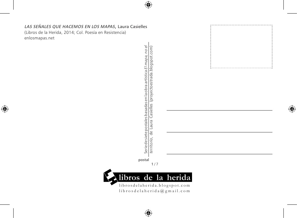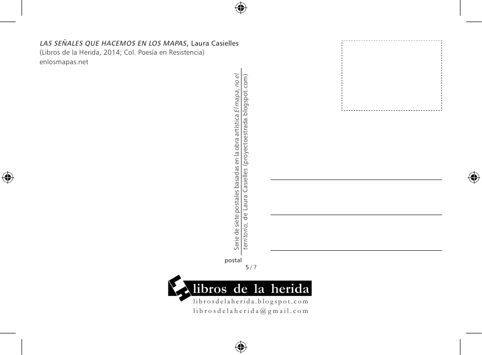 Estas postales son un diseño de Laura Casielles y Libros de la Herida a partir de «El mapa, no el territorio», una obra de poesía visual que la autora realizó para la exposición Estrada. Cuadernos de Viaje, comisariada por Alba González Sanz y Job Sánchez Julián. El catálogo completo de la muestra se puede ver aquí.
